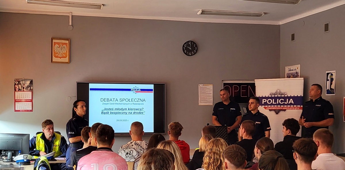 Radziejowscy mundurowi spotkali się z uczniami IV klas Zespołu Szkół Mechanicznych w Radziejowie na debacie „Młody kierowca = bezpieczeństwo na drodze”.