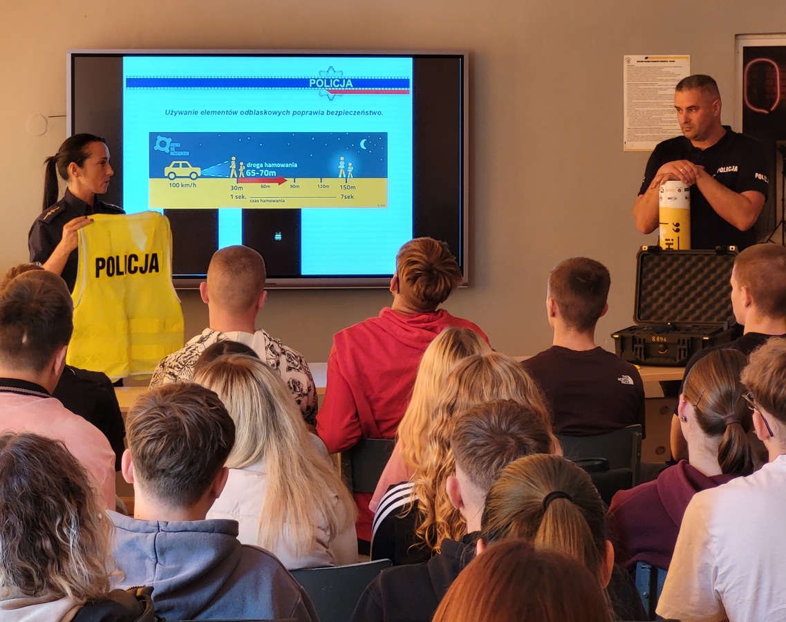 Policjanci przedstawili statystyki zdarzeń drogowych w naszym powiecie, omówili ich przyczyny i najczęściej popełniane błędy, przez uczestników ruchu drogowego. Przypomnieli o zasadach zachowania podczas policyjnych kontroli drogowych. Policjanci omówili obowiązujące przepisy ruchu drogowego oraz konsekwencje ich nieprzestrzegania. Uczniowie mieli okazję zobaczyć jak wygląda miernik prędkości, urządzenie do badania stanu trzeźwości oraz na zawartość narkotyków.
