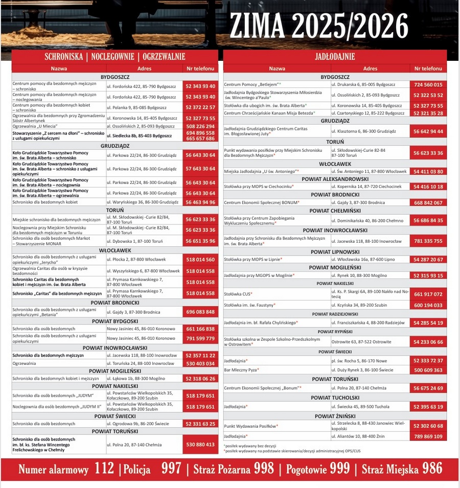 Poniżej wykaz schronisk i jadłodajni dla osób potrzebujących w woj. kujawsko-pomorskim:
