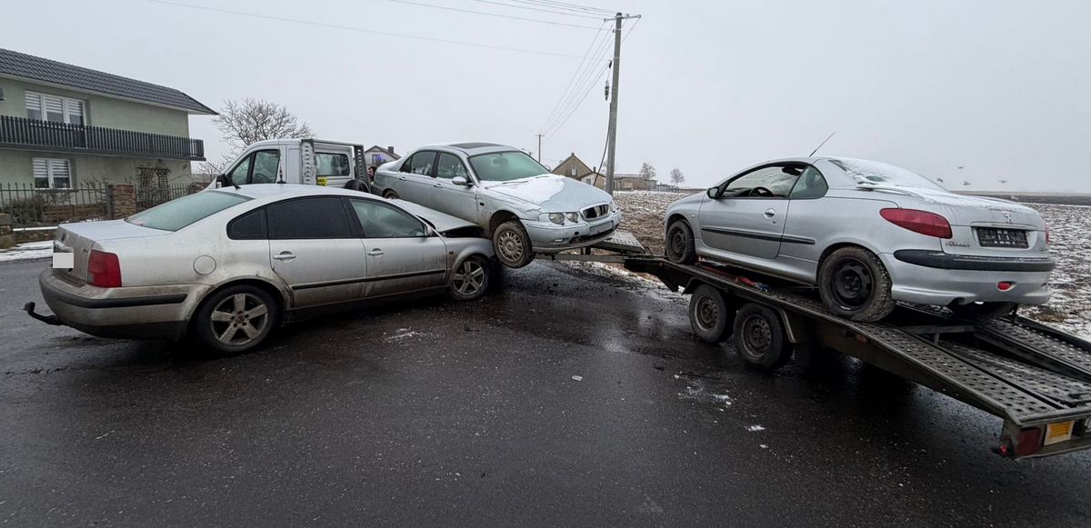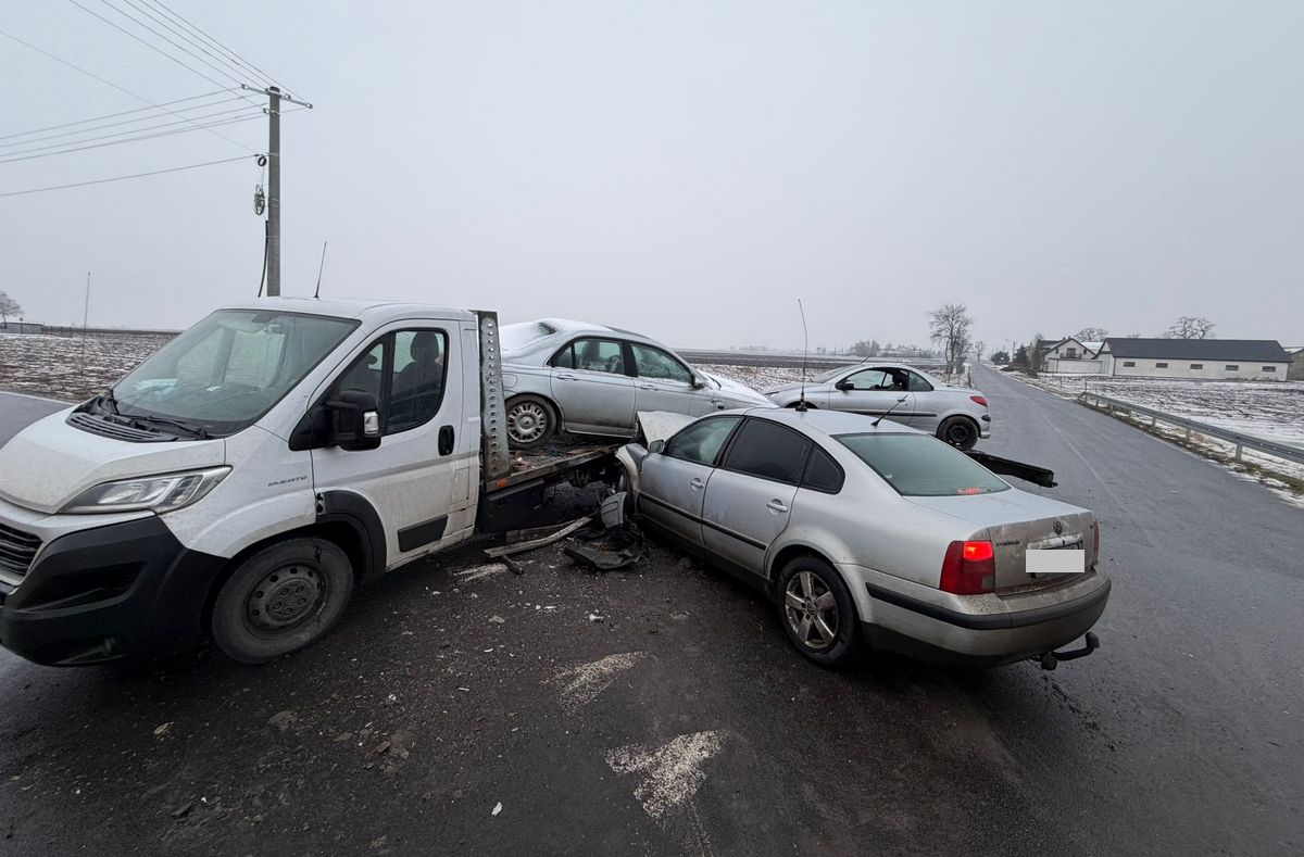 54-latek kierujący Volkswagenem, na śliskiej drodze nie zapanował nad autem. Skręcając w prawo uderzył w lawetę, która przewoziła dwa samochody. Mężczyzna został przewieziona do szpitala na badania. Obaj kierujący byli trzeźwi. Za to zdarzenie policjanci pouczyli kierowcę Volkswagena.