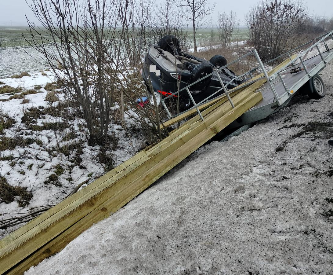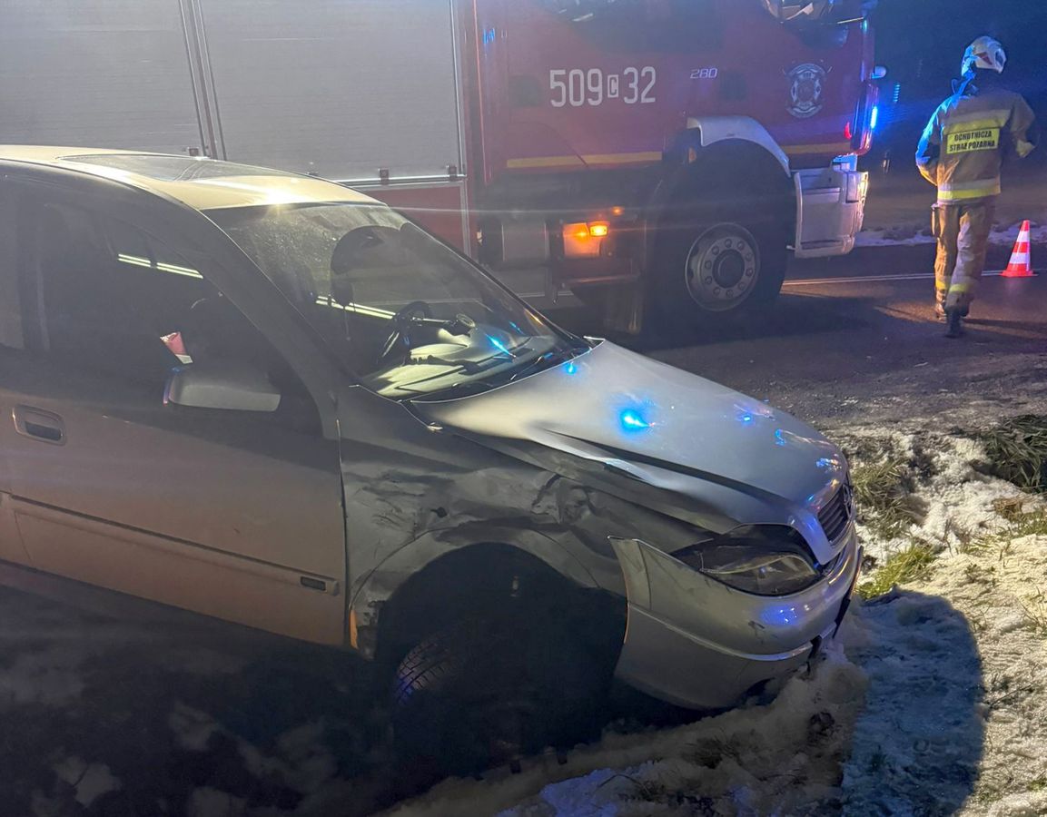 Do obydwu kolizji doszło w piątek (16.01.26r.). Pierwsza o godz. 11:40 w Jarantowicach na drodze krajowej nr 62. Jak ustalili policjanci, kierujący Kią z przyczepką, nie zapanował nad autem i zjechał do rowu. Tam samochód przewrócił się na dach, a przewożony materiał wypadł z przyczepy. Siedzący za kierownicą 51-latek był trzeźwy i nie odniósł żadnych obrażeń.
