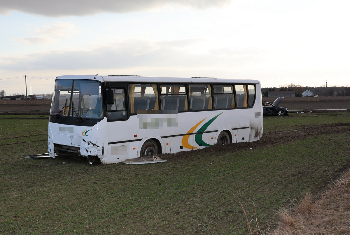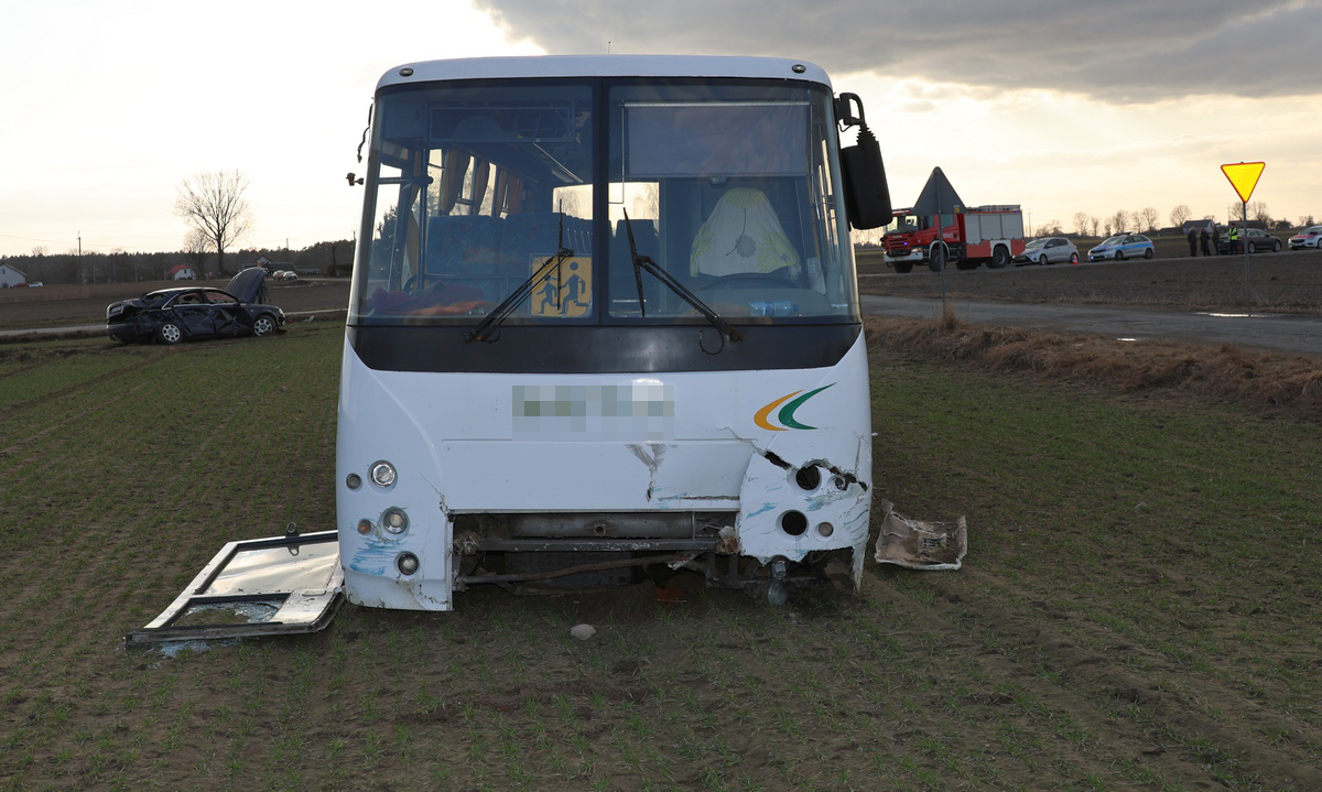 Zderzenie autobusu szkolnego z autem osobowym w Woli Skarbkowej (pow. radziejowski)